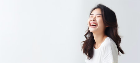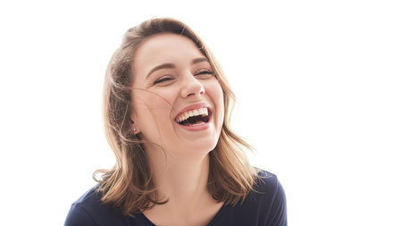 A woman laughs, head and shoulders in frame, with eyes shut and mouth wide open against a white backdrop. The image features soft lighting and a focus on natural skin tone. This shot is suitable for various editorial and commercial applications.