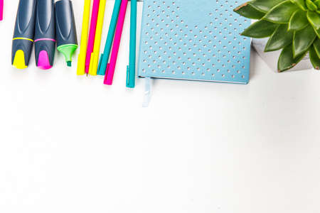 Layout for the office. back to school. Blue notebook, colorful pens, felt-tip pens, paper clips, potted echeveria. Place for text