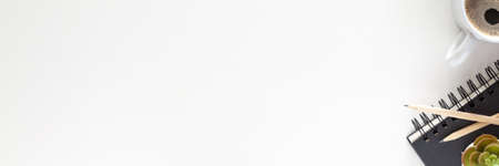 White desk at home with coffee, succulent and notebook. View from above. Copy space. Panorama.