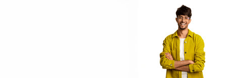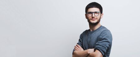 Panoramic banner, portrait of young confident guy with crossed arms wearing eyeglasses on white background with copy space.