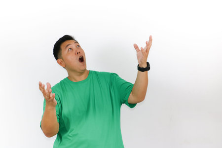 An amazed Asian man in a green t-shirt with both hands raised in complete surprise, looking directly at the camera with wide eyes and open mouth.