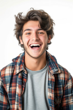 A close-up portrait shows a man smiling broadly against a plain white backdrop. The image features a bright, well-lit composition, highlighting the subject's expression. The overall style suggests a studio setting, suitable for a range of commercial applications like advertising and editorial content.