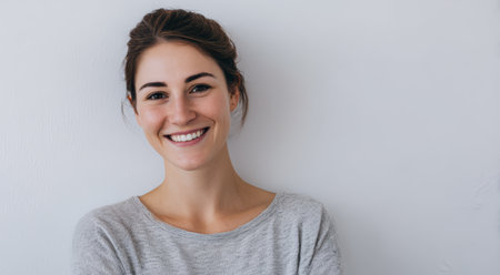 A woman with brown hair is smiling in front of a white wall. She is wearing a light gray top. The room is bright and simple, creating a friendly atmosphere in the daytime.