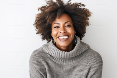 Isolated shot of happy charming woman with Afro hairstyle wears snow white poloneck jumper being in good mood after going shopping poses in studio expresses happiness Pos : Generative AI