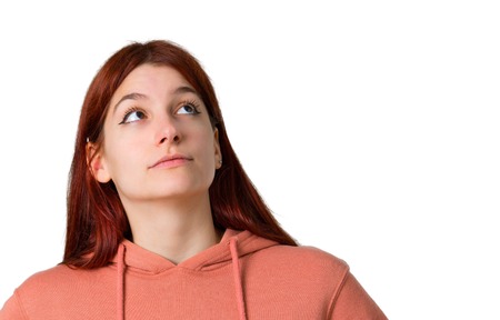 A young woman with brown hair tied up looks up thoughtfully. She wears a floral button-up shirt with a warm tone. The backdrop is simple and neutral, drawing focus to her expression.