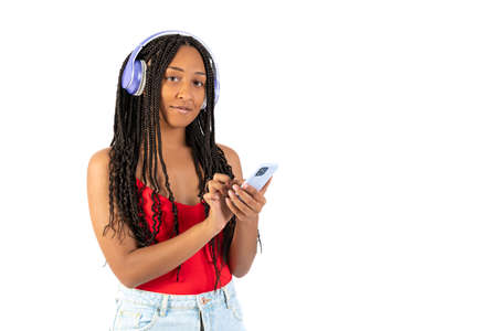 Laughing black woman listening music with headphones and cellphone isolated over white background