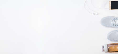Concept of healthy lifestyle. Flat lay sport shoes, new sneakers on a white background