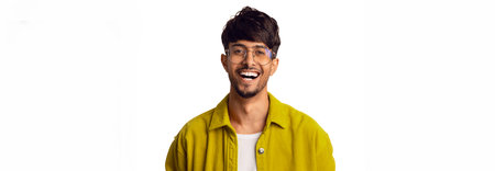 A young man displays a cheerful expression, showing his vibrant personality. He wears a yellow shirt that adds a lively touch against a neutral backdrop, radiating positivity and warmth in the atmosphere.