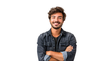 The image features a young man with shorts, curly hair and a beard. He is wearing a light blue denim jacket over a brown shirt. His arms are crossed, and he is smiling warmly at the camera. The background is plain white, putting the focus entirely on him.