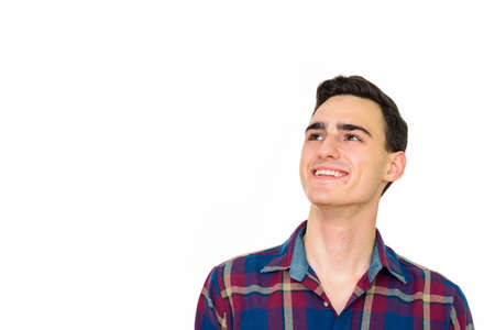 Portrait of happy smiling asian young handsome man looking up at empty copy space isolated on white background