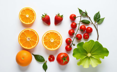 Fresh fruits and vegetables arranged on a clean white background, showcasing healthy food choices and vibrant colors.