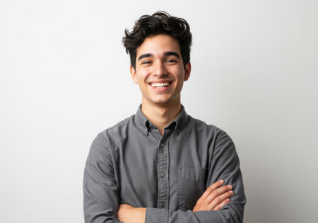 A portrait of a young man with dark hair, smiling broadly with his arms crossed. He is wearing a gray button-down shirt. The background is plain white, highlighting the subject's cheerful expression and confident posture. The image captures a sense of youthful energy and approachable demeanor.