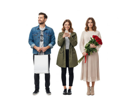 happy couple with bouquet of flowers and shopping bags isolated on white