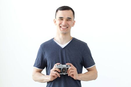 Vintage, photographer and people concept - handsome asian man with retro camera over white background