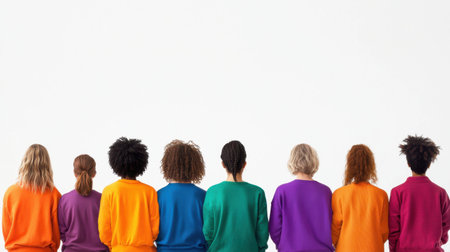 Eight individuals stand side by side, showcasing a variety of vibrant sweaters in different colors. They face away from the viewer, creating a striking visual of unity and diversity.