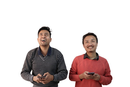 A smiling Indian man wearing sweaters while using mobile phones isolated on a white background