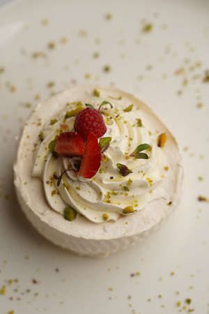 Strawberry pavlova cake, meringue nest dessert, close-up