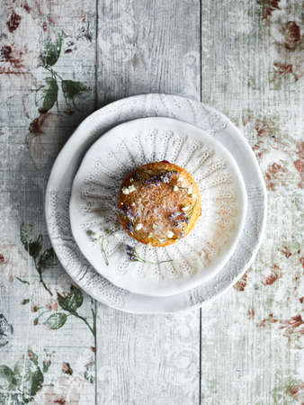 one cupcake with cookies, rosemary, blueberries on a white saucer, on a dark background.