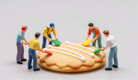 Small figurine bakers gather around a large pie, joyfully spreading vibrant frosting in a delightful act of decor. Their team spirit brightens the imaginary kitchen.