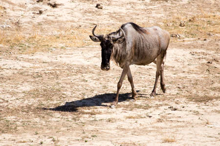 A wildebeest (Connochaetes taurinus) calmly walking in dry grassland. Evening sun and sand round.