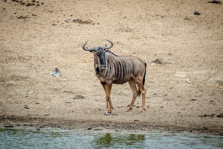 Blue wildebeest male standing by the water in the Kruger National Park, South Africa.