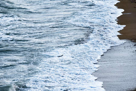 White foam on a black lava beach in southern Iceland. Sea aerial view and top view. Amazing nature, beautiful backgrounds and colors