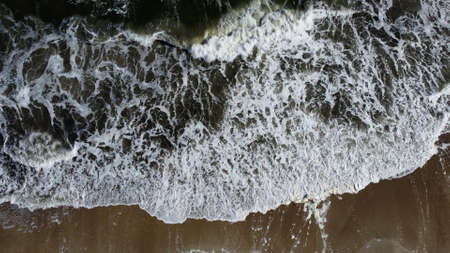 Aerial drone view flight over sea waves that roll onto sandy shore.