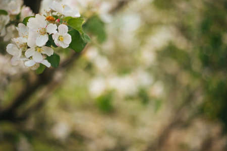 background with spring apple blossom. Blossoming branch in springtime Blooming apple tree in spring time.fresh Apple tree twig with flowers and leaves on garden