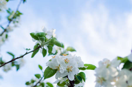 White branches of a flowering Apple tree against the blue sky. Flowering garden trees in the spring.