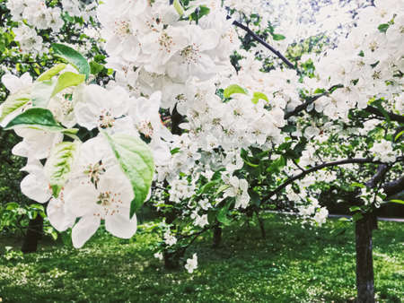 Beautiful nature background. Blooming apple tree in garden with flowers
