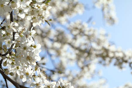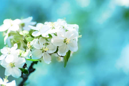 Beautiful floral spring abstract background of nature. Branches of blossoming apple tree light blue sky background. Copy space. Nature background