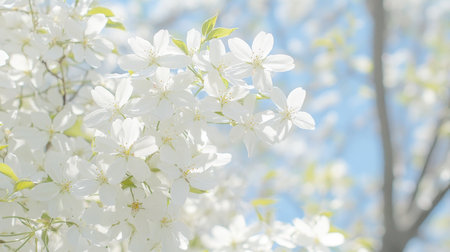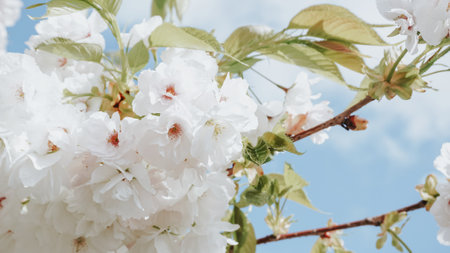 A beautiful branch of white cherry blossoms featuring delicate petals set against a soft blue background, perfect for spring-themed designs.