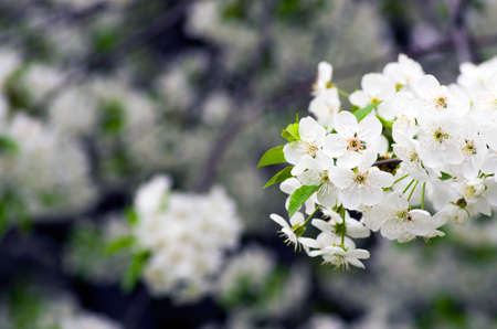 Cherry tree blossoms. White spring flowers close-up. Soft focus spring seasonal background.