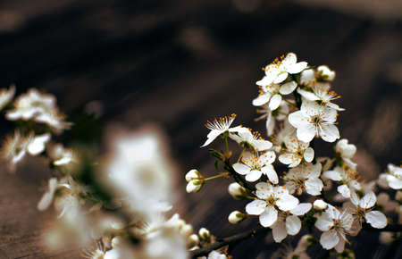 Spring tree branch with small white flowers. Background. Copy space. Vintage tinted glass.