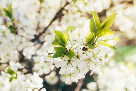 White cherry tree flowers close-up. Soft focus. Spring gentle blurred background. Blooming apricot blossom branch. Beginning of season, awakening of nature. Fresh green leaves.