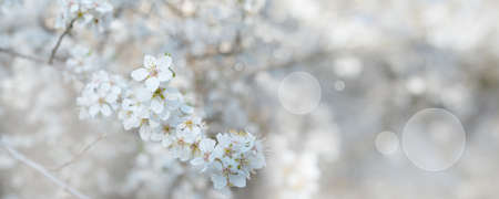 Banner. macro photography. Spring, nature wallpaper. Plum blossoms in the garden. Blooming white flowers on the branches of a tree. Blurred background. bokeh.