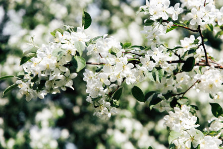 photo of the flowering Crabapple tree with white flowers on the green bokeh background macro
