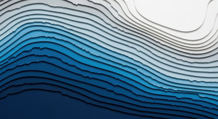 An abstract geometric created with a layered paper cut effect. The shape resembles a starburst or a deep tunnel, with concentric layers receding into the distance. The color palette consists of cool shades of blue, from deep navy to light sky blue, interspersed with crisp white layers. Each layer has a distinct edge, creating shadows and a strong sense of depth and dimension. The overall aesthetic is modern, minimalist, and visually striking, with a clean and crisp finish.