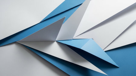 An abstract geometric composition created by folding and arranging pieces of paper. The dominant colors are crisp white and a vibrant blue, creating a striking contrast. Sharp angles and clean lines define the shapes, which are arranged in a dynamic and visually interesting manner. The overall impression is one of modern, minimalist with a focus on form and structure.