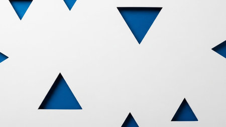 A minimalist abstract background a repeating pattern of white geometric triangles. These triangles are cut out from a white surface, revealing a vibrant, solid blue color beneath. The sharp edges and clean lines of the triangles create a sense of precision and modern The contrast between the white and blue is striking, making the shapes stand out. This composition is simple yet visually engaging, various applications requiring a and contemporary feel.