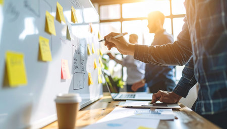 Close up of a collaborative brainstorming session with colorful notes in a modern office setting