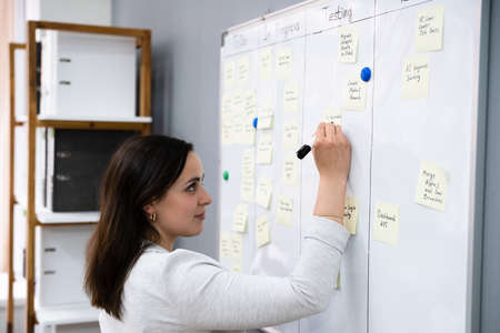 Female project manager planning work on project, teamwork, writing tasks on whiteboard in table cells, making Kanban scrum board for effective productive management. Cropped shot of businesswoman