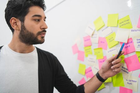 Businessman using sticky notes on business meeting.