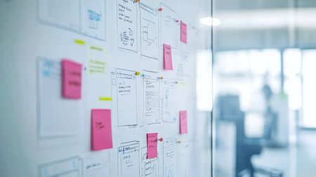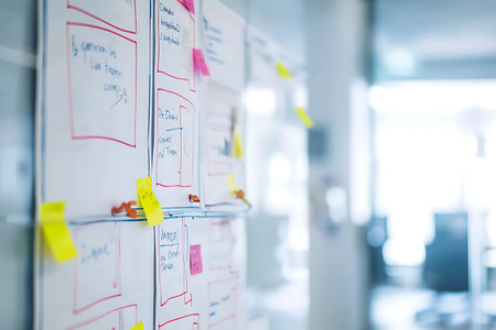 Colorful charts, notes, and diagrams organized on a whiteboard illustrate the planning and brainstorming process in a modern office environment, fostering collaboration and creativity.