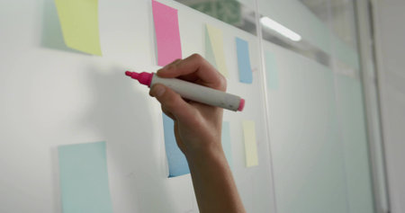 Businesswoman uses a pen in her hand to write a note on a notepad on white board to remind and brainstorm business ideas.