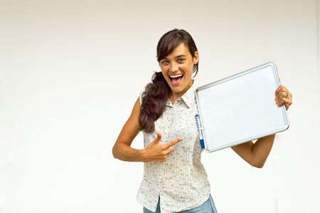 A casual dressed woman in front of white background , presenting a markerboard that could contiain a message relevant to an advertisment.
