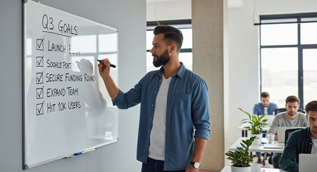A young business owner writing budgeting ideas on a whiteboard in a creative office, with coworkers AI generated