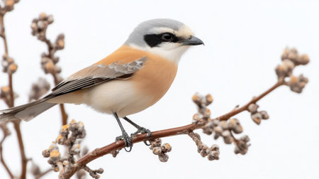 striking northern shrike is nestled on a slender branch, its distinctive hooked beak prominently displayed as it gazes intently, embodying the essence of avian grace.