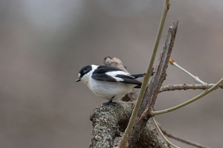 Close-up portrait of a male collared flycatcher (Ficedula albicollis) sitting on a branch against a blurred background