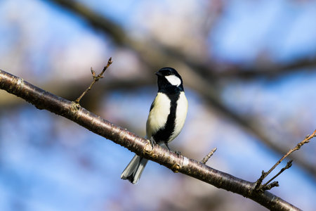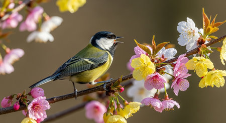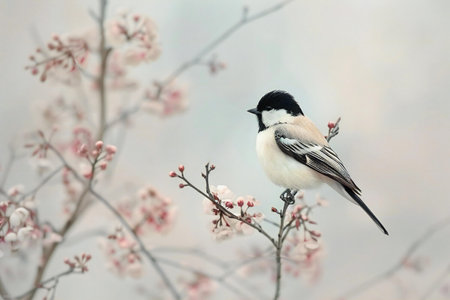White-crested Tit (Parus albus) perched on a tree branch with pink flowers